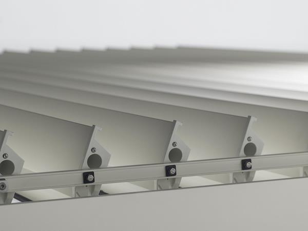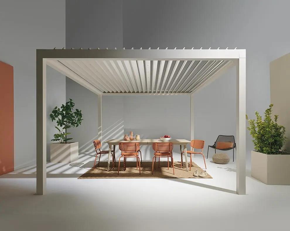 La "Gibus Movie" se distingue par son design épuré et ses capacités de régulation du microclimat, grâce à ses lames en aluminium orientables. Ces lames, animées par un système motorisé, permettent une adaptation parfaite à toutes les conditions météorologiques, offrant une ventilation naturelle ou une protection contre la pluie, selon le désir de l'utilisateur.